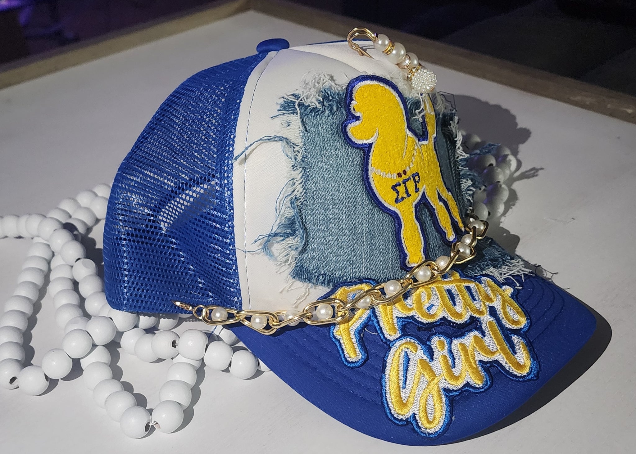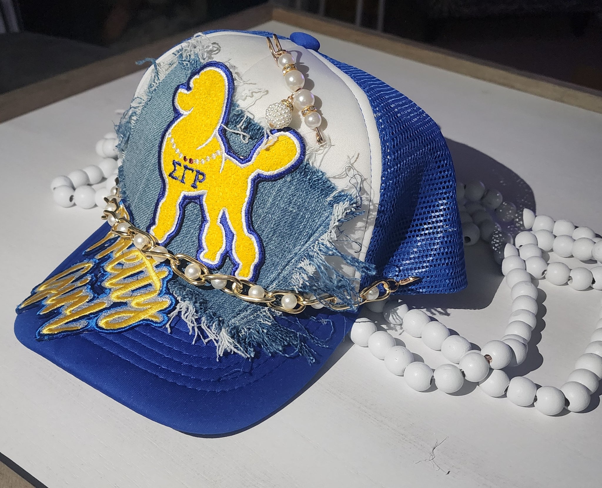 Be the ultimate cool diva in this two-tone team hat. Blinging in style and being pretty for the occasion. Please be advised all hats comes with additional bling buttons and pins.